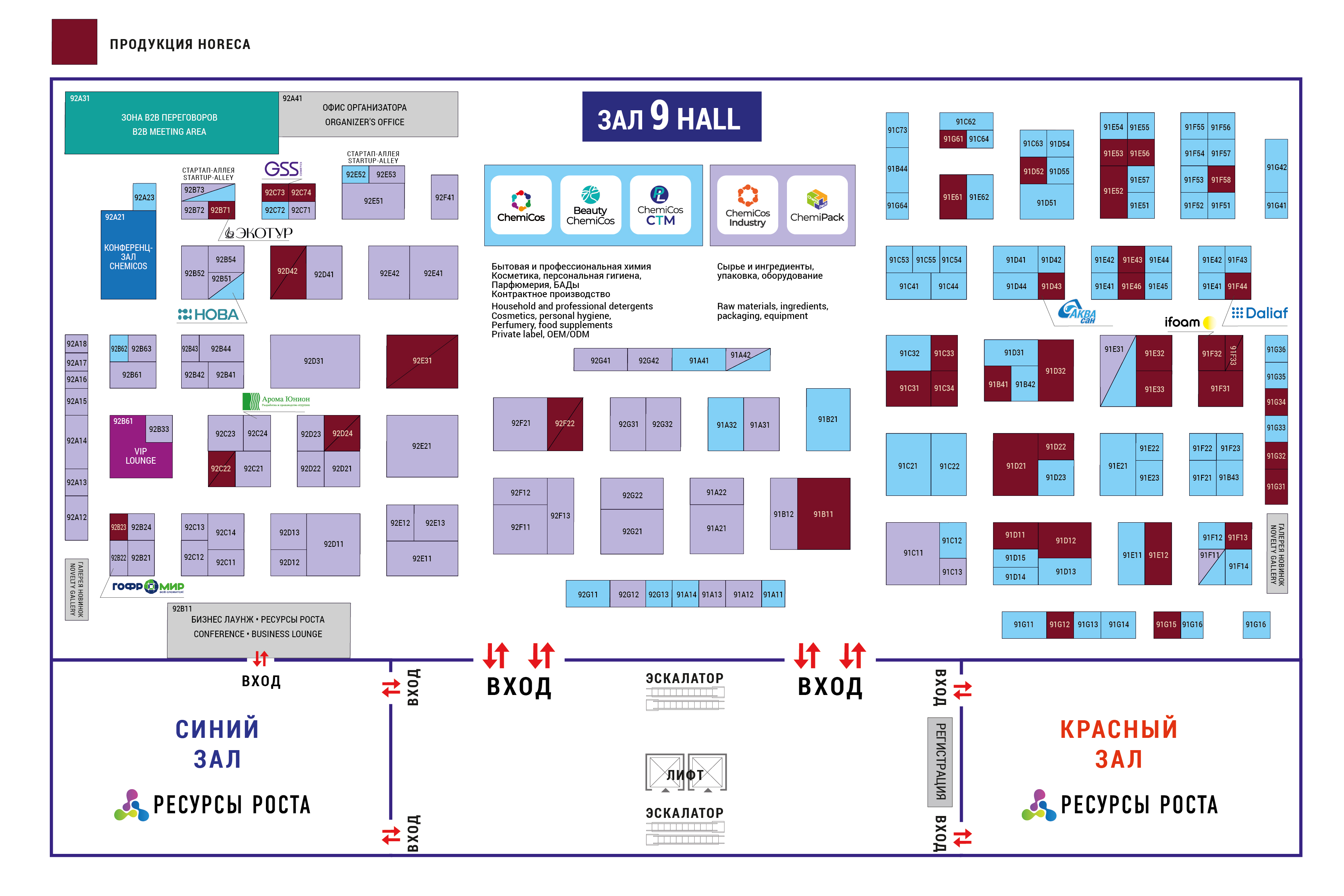 9 зал – профессиональная химия и ароматизация помещений для отелей, ресторанов и пространств общественного питания: Химпромлаб, Нэфис Косметикс, Ifoam, Аквалон, Аквасан, Ниопик, Арома Нота, Экотур, Kneissmi, Amarion, Альтэрос, Куряночка (Выдумщики), LM, Nicselle, Технопро, РТК, Орион, Коро, Прония, Тюменские Аэрозоли, Русинтез (Daliaf), АМС Кемикал, LAVR, КемПлант, Премиум Микс, Флора, КемПлант, ЛИМЭП (НИИМЕСТПРОМ), Сириус, Рустабэкспорт, Химпромлаб (Оптиком), Бархим, FustBuy, АЕР, Delfin Group, GOODHIM, Guangzhou HengYu Iron-Printing and Can-Making Co., Ltd, Guangzhou Junkai Cleaning Detergen Ltd, Guangzhou Magic Crystal Trading Development Co., Ltd, Hainan Kunyuan Life Technology Co., Ltd, Hamdi Al-Bakri & Partners co., Афипский завод бытовой химии, ДЕЗБ2Б, НОРВИН, ХимЭтика, ЭкоЛюкс, GSS Cosmetics.